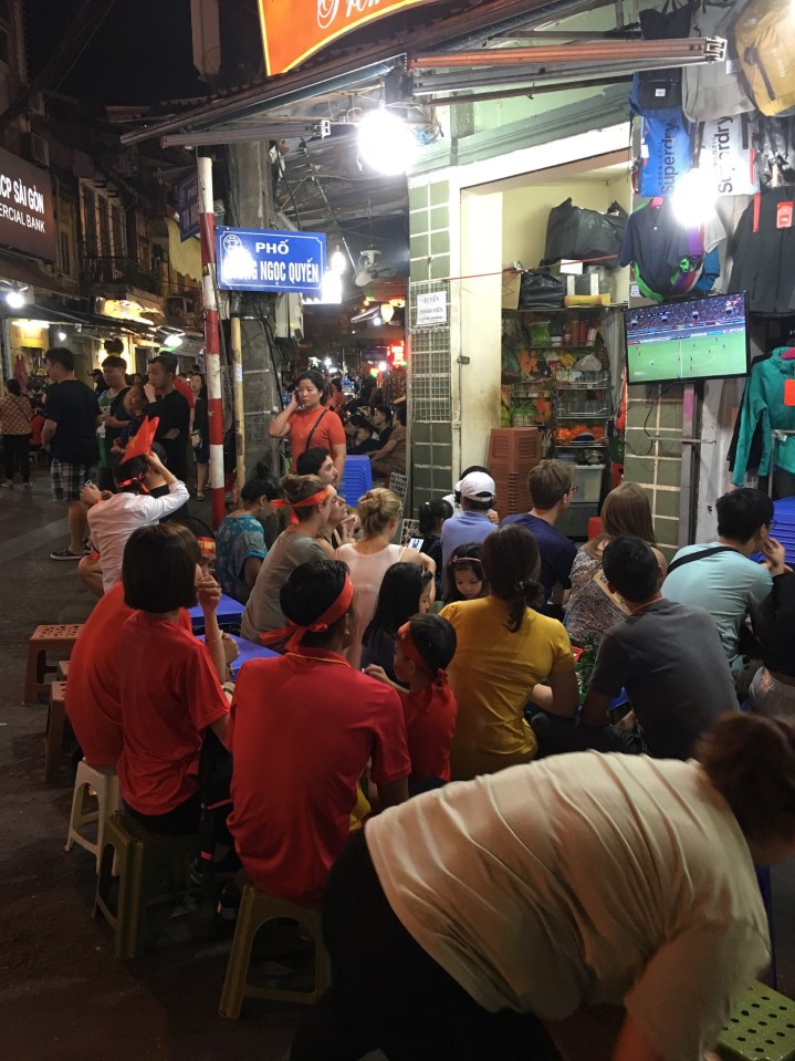 Every where you looked, people were sitting on small stools facing TVs with their Bia Ha Noi (Hanoi beer) and their dinner. The streets were packed and the bars were packed. It was just such a great atmosphere. AND the Vietnamese won