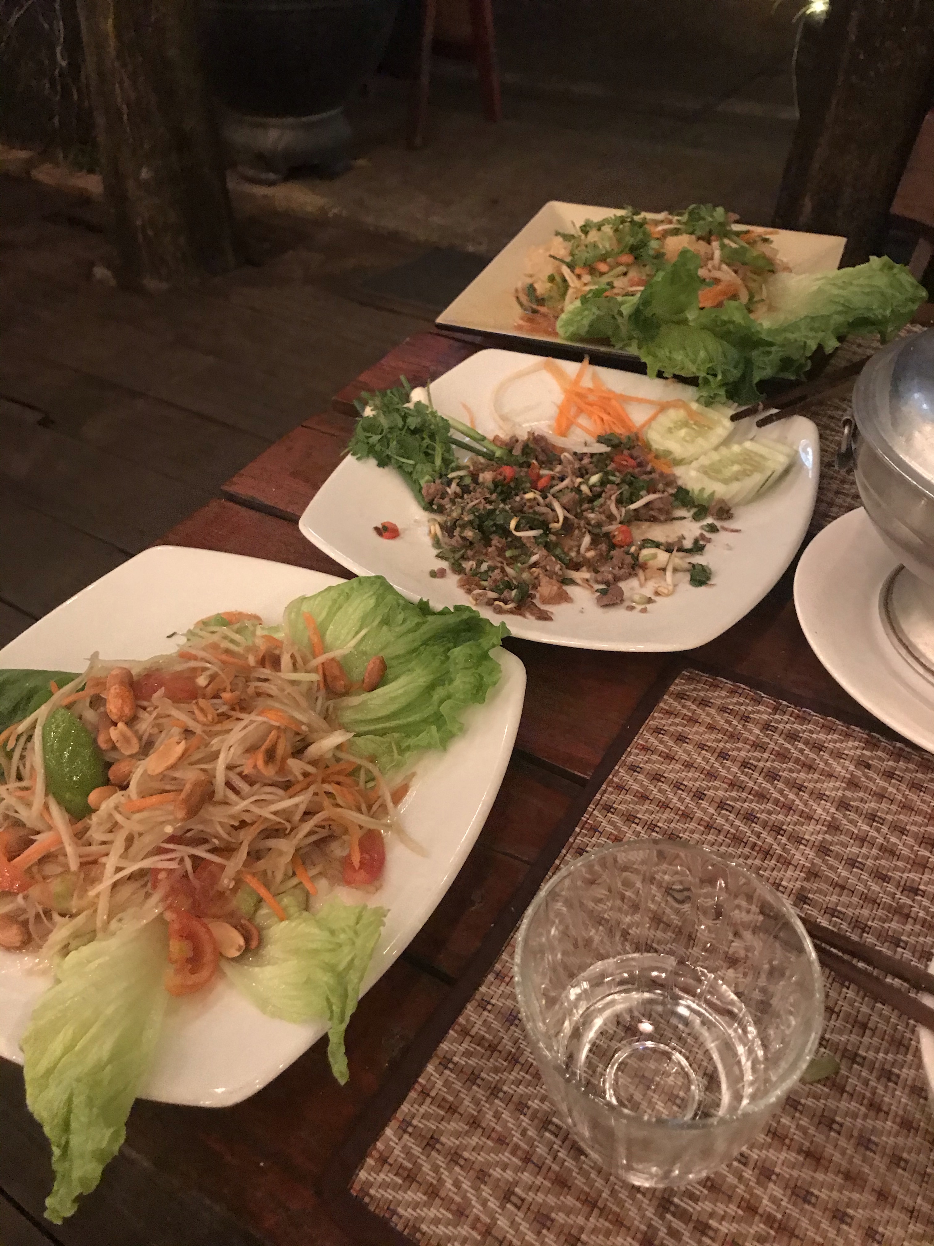 After swimming and cooling down, we headed out for dinner. We went to this lovely restaurant on the Mekong River, where we got larb, the unofficial national dish of Laos. It is delicioussss