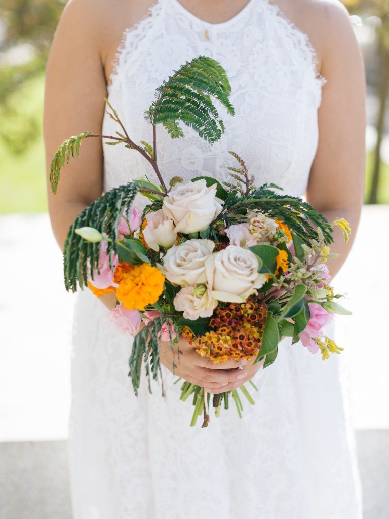 I loved my bouquet. I got it at my favorite florist, Ampersand. They make the absolutely best bouquets. I highly recommend them. They were able to incorporate marigolds and mute pink roses into it. I know a super weird combination, but I wanted marigolds and the mute pink roses. Marigolds for my heritage (i tried finding a red dress or a sari to wear instead of the white dress. Let me say all of them were horrible). And i absolutely love muted pink roses.